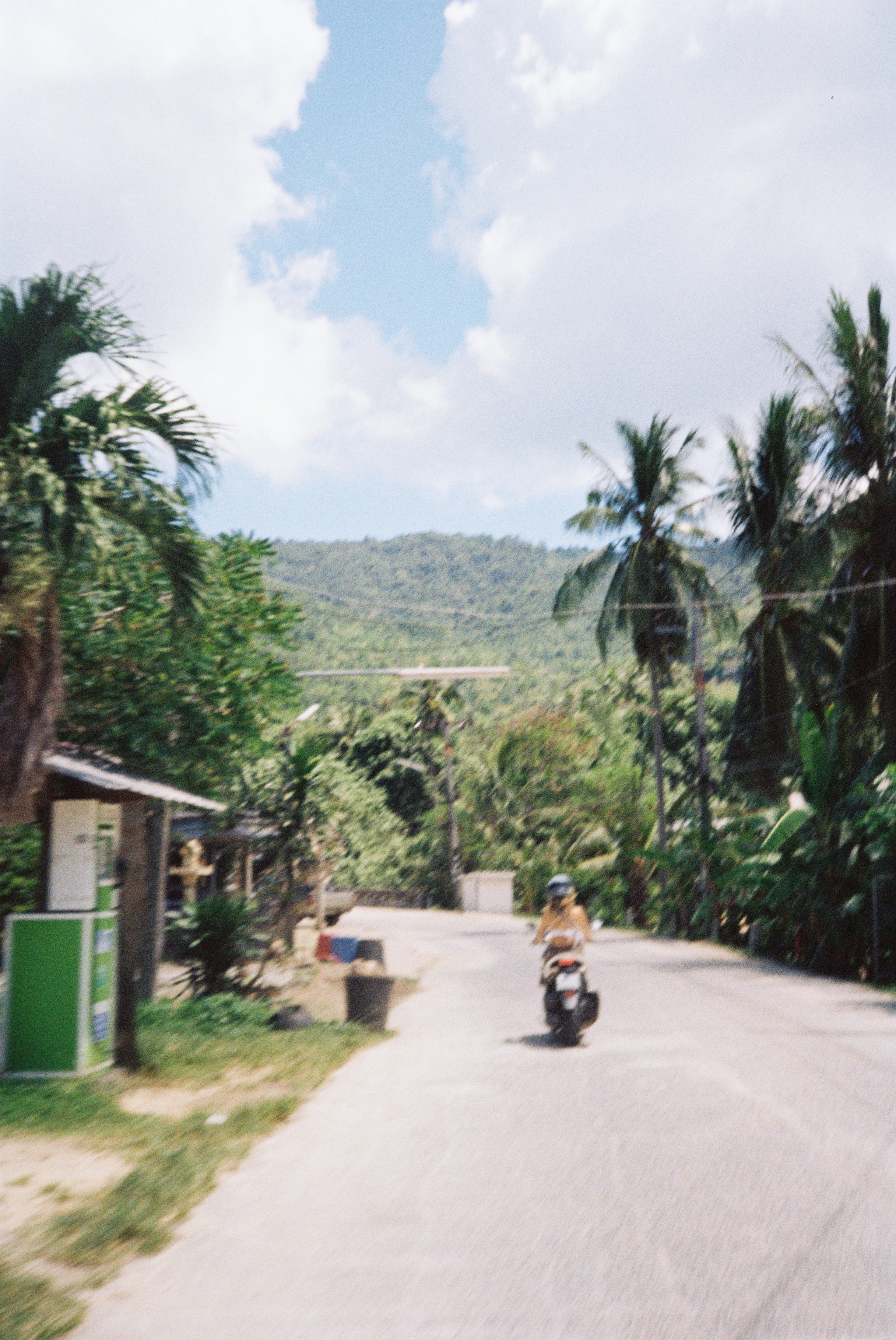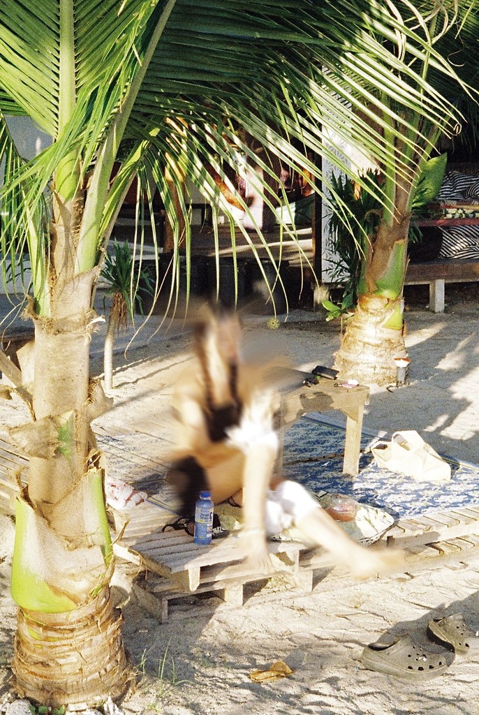 Our scooters are parked across the cafe. Mine, a rundown Honda that I’ve rented for 50 bucks a week and am happy if it starts on the first try. Hers, more classy. Looks like a green Vespa, but most likely is a Chinese knockoff. She’s not wearing a helmet, which gives me a second of pause, but the beach is close.