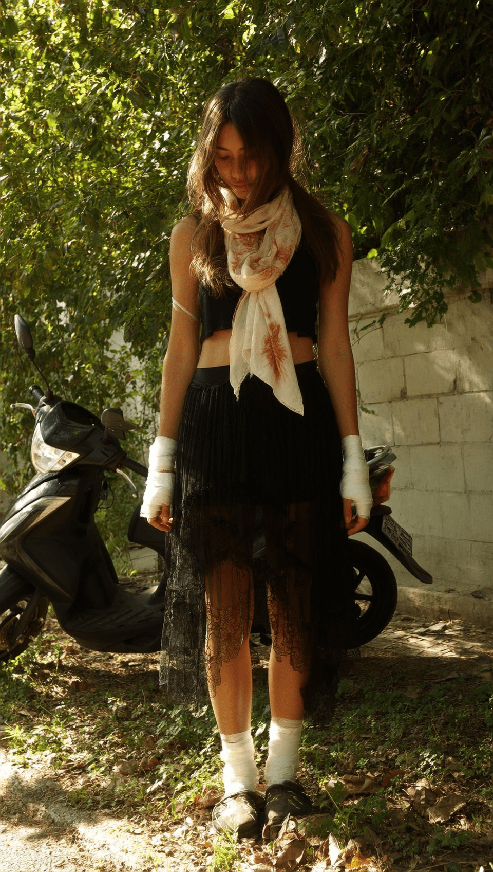 The wounds on her knees have opened again. Blood pushing through the bandages. Now dark at the edges, threatening to drip. She lifts her knee, touches it, studies her own fingers for a moment, then slowly wipes them off on her pelvis. A thin red smear. She looks at me with big, sad eyes. Helpless.